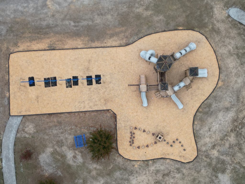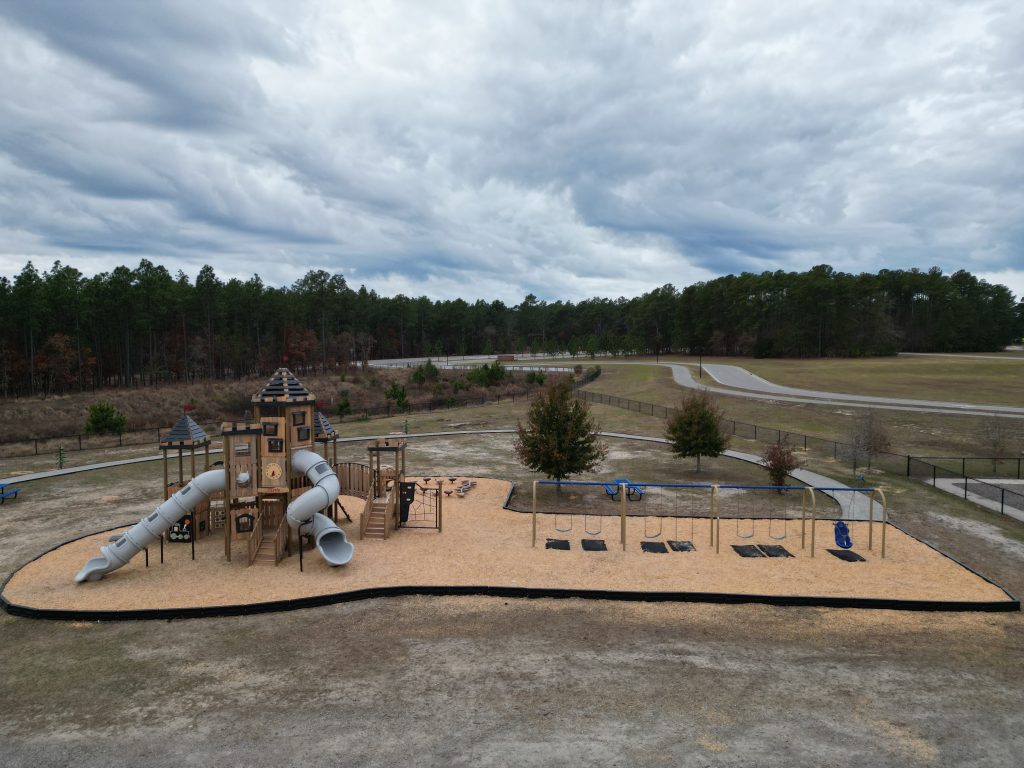 In addition to the castle, the playground features a four bay swing set as well as a natural balance and climbing area. The entire playground is surfaced with wood mulch for fall protection.
