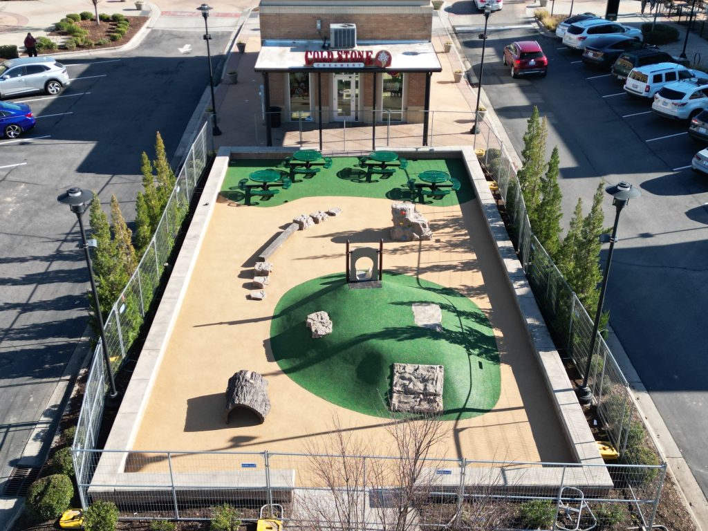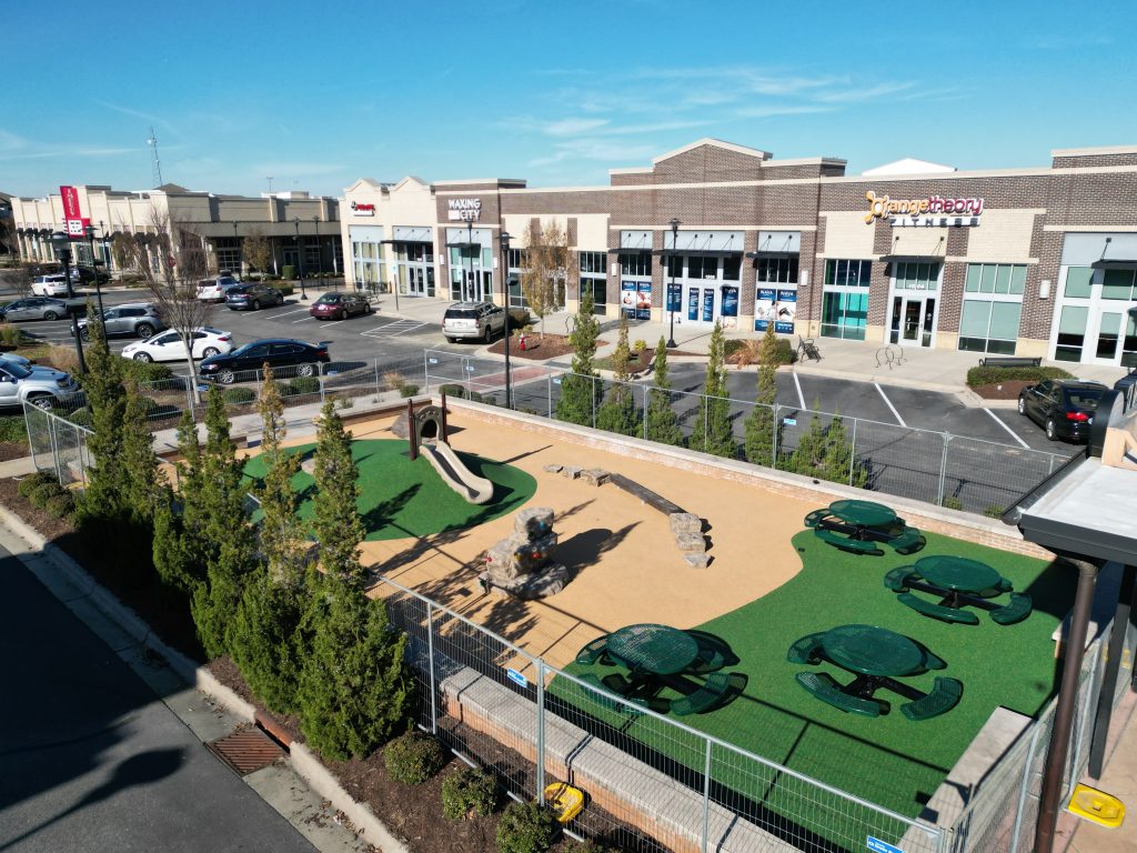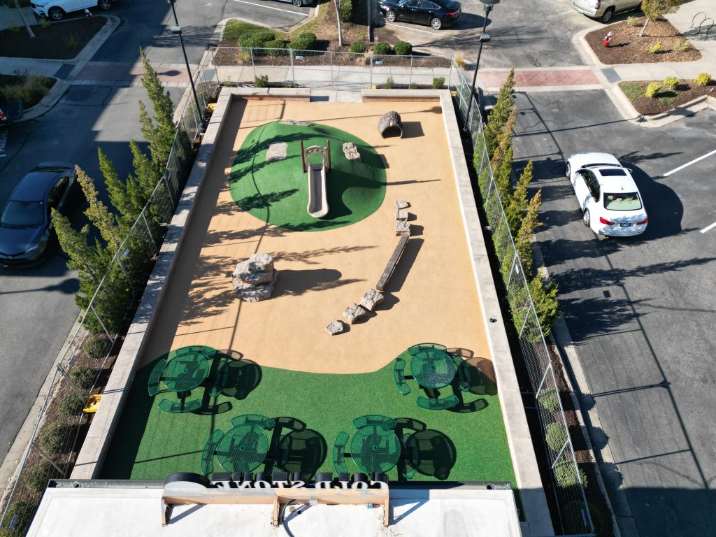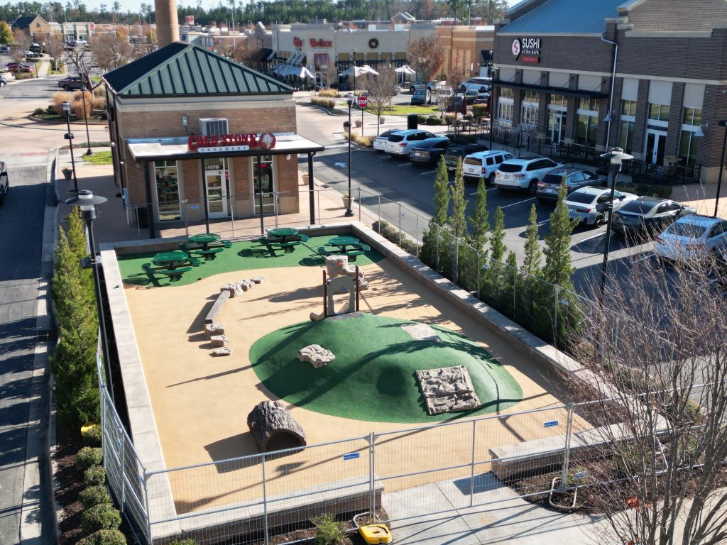 We successfully designed a play space that allows community members to enjoy the outdoor environment as they come and go from their shopping and dining. Upon entering the playground, visitors are welcomed with a seating area overlooking the natural themed playground. Children are encouraged to engage in both active and imaginative play as they navigate the crawl logs, hop rocks, balance beams, and a custom playside hill.